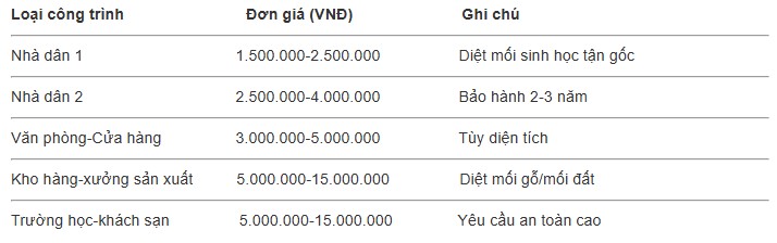 Lưu ý: Giá dưới đây là giá trung bình, có thể thay đổi tùy diện tích và mức độ mối. Tuy nhiên Trường Sơn cam kết: